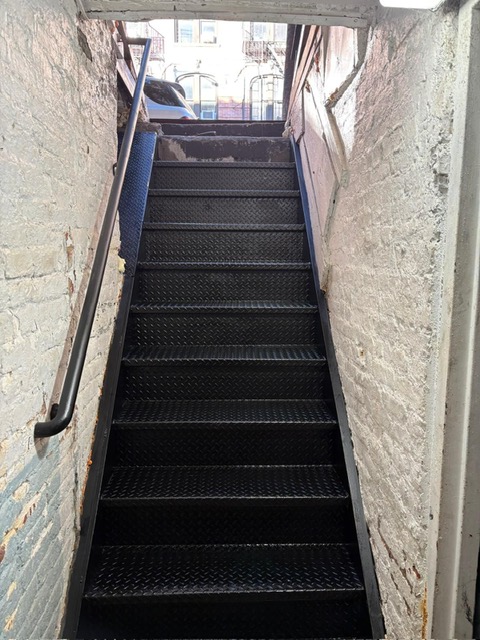 Open tread basement interior diamond plate metal staircases square tube railing support posts, forest hills queens ny