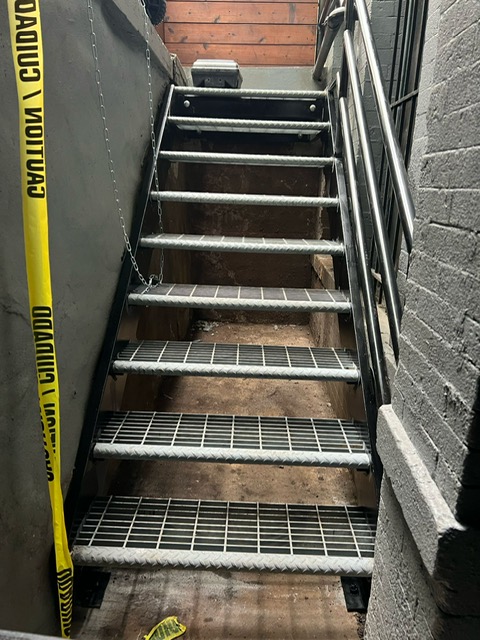 Basement and storefront access staircases are the most common commercial request — closed tread diamond plate or open tread grating stairs replacing old wood or concrete steps for retail storefronts and apartment building basements. Interior commercial egress staircases are fabricated for multi-story commercial and residential buildings, typically using stair pans filled with concrete or diamond plate closed treads. Outdoor and backyard staircases use galvanized steel for corrosion resistance, with open tread grating or diamond plate and welded pipe railings. Floating and architectural staircases are custom-designed for restaurants, lofts, and commercial spaces where appearance matters as much as function. Multi-level staircases with landings handle long floor-to-floor runs requiring one or more intermediate landings — common in warehouses, factories, and multi-story commercial buildings.
