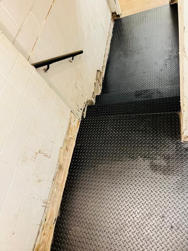 Storefront Basement access steel closed diamond plated staircase fabricated and installed.