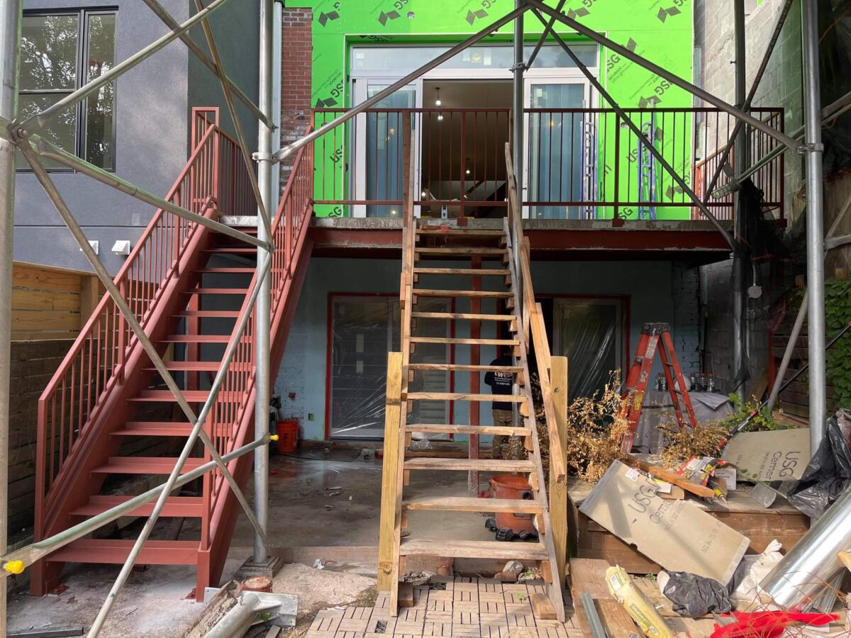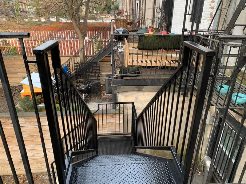 Metal staircases with 2 landings, supports and safety gate at top williamsburg, Brooklyn