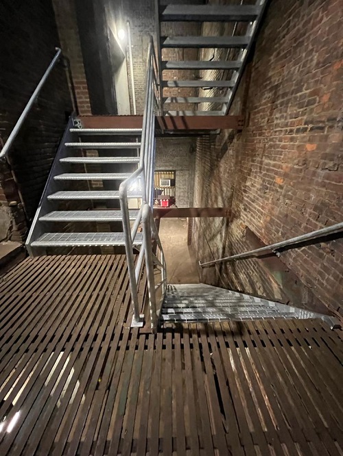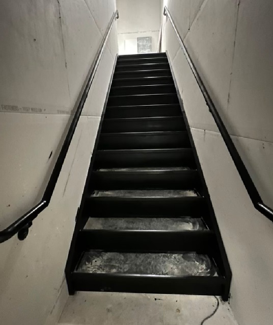 Open tread diamond plate interior fireproof basement store stairs painted black