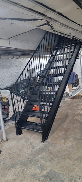 Exterior metal stairs with open tread diamond plate fully welded steel steps and solid railings.